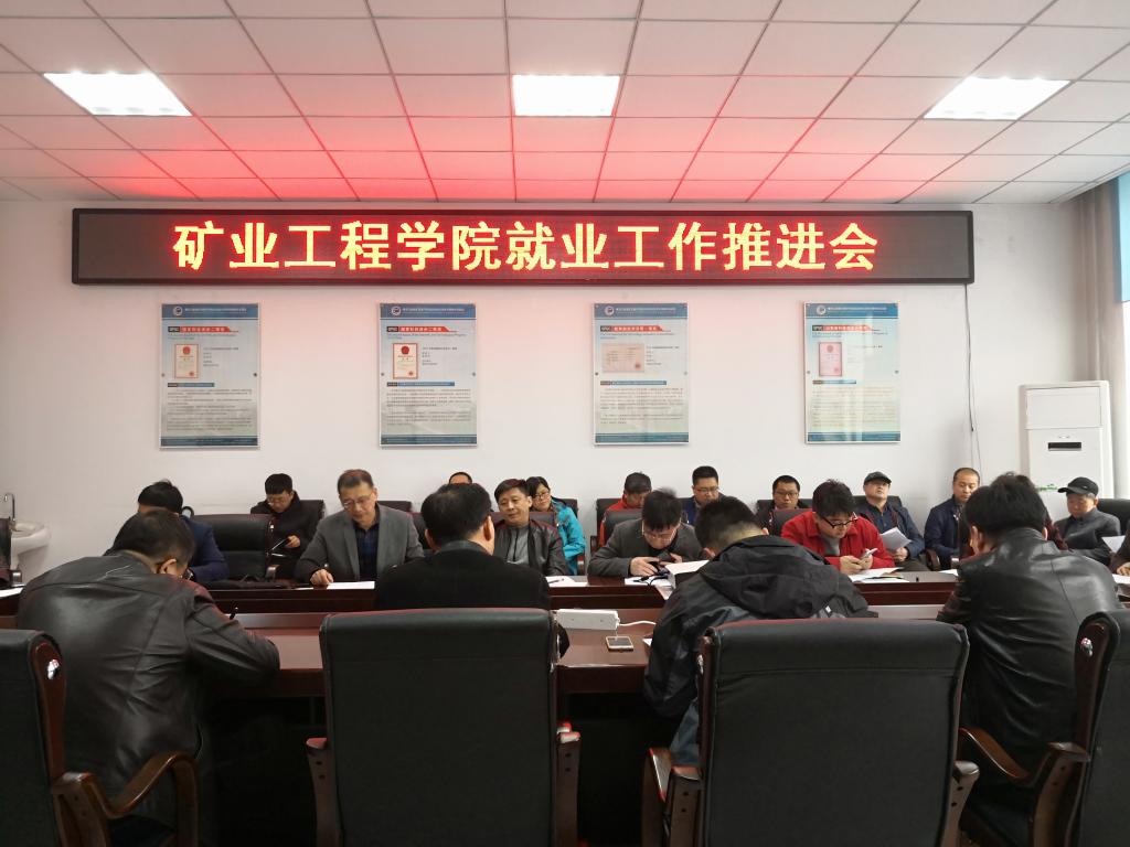 410日下午,矿业学院在学院一楼会议室召开了2018届毕业生就业工作推进会。学院党政领导、各教研室主任、全体辅导员及毕业班班主任参加了本次会议。会议由学院党委书记赵喜江主持。
