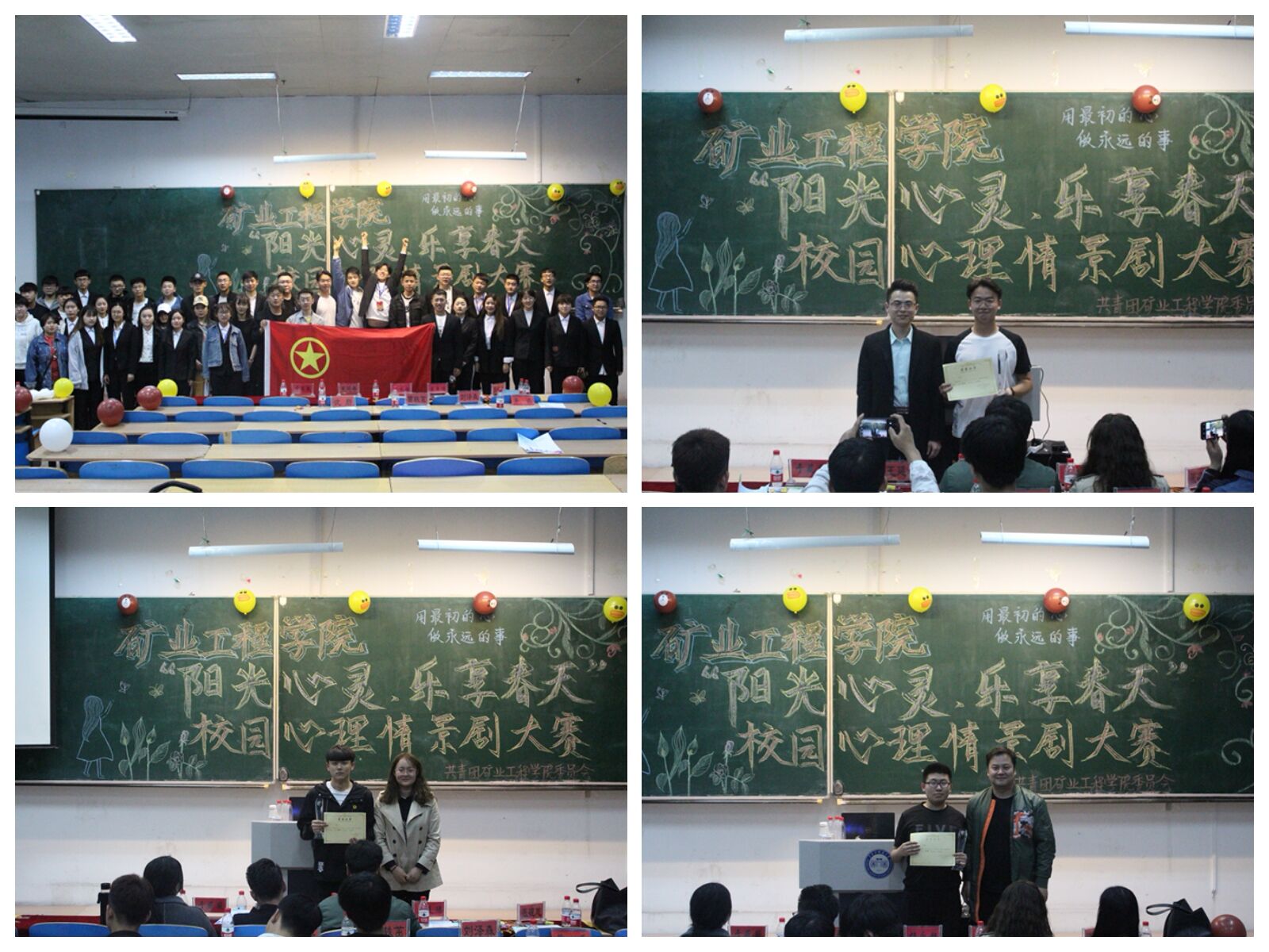 本届心理情景剧大赛分为初赛和决赛两个阶段,有6支代表队进入决赛,经过参赛代表队精湛的演技、经典的台词和精彩的剧情,给观众们留下了深刻的印象,现场不时爆发出阵阵热烈的掌声。最终,采矿18-4班《有你们,我无悔》荣获冠军,采矿18-2班《应不应该》荣获亚军,勘查18-2班《自我的救赎》荣获季军,采矿18-1班《寻me》、城乡18-2班《面对》获得优秀奖,测绘18-3班《青春那点事》获得最佳创意奖。