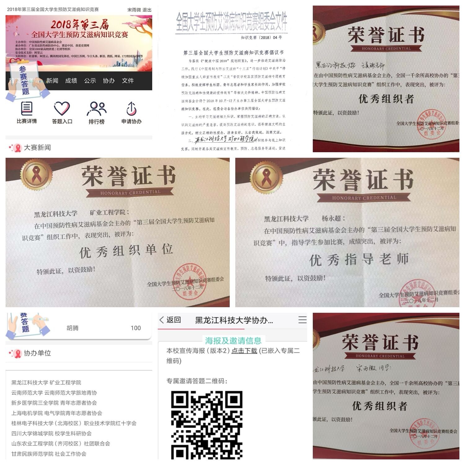 12月30日,由中国预防性病艾滋病基金会主办、多家单位承办的“2018年第三届全国大学生预防艾滋病知识竞赛”落下帷幕。我校3003新葡官方网站作为全国1000家高校团委/社团等组织其中之一积极承办了本次活动。参赛期间,3003新葡官方网站积极筹备、扎实推进,共组织796人参赛,由于表现突出,学院荣获“优秀组织单位”荣誉称号,辅导员杨永超荣获“优秀指导教师奖”,王美鸥老师、宋雨微同学荣获“优秀组织者”荣誉称号。