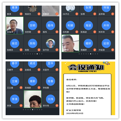 8月21日,学院利用钉钉网络平台召开了新学期全院教职工大会。会上,学院各分管领导先后对新学期教学、科研、研究生、学生、工会等方面工作进行了安排和部署。会议要求,全院上下要在思想上做到坚决不松懈,把师生生命安全和身体健康放在首位,统筹推进疫情防控和学院重点工作,在疫情防控常态化的基础上认真做好学院事业发展各项工作,确保如期完成年初既定目标任务。会议强调,2020年已将近过半,时间不等人、发展不等人,全体教职工要有等不起的紧迫感、慢不得的危机感、坐不住的责任感,坚持目标不动摇,切实做到各项工作“不缺位”“不漏项”“不延误”“质量不降低”,确保“收官之年”圆满收官,“开局之年”精彩开局。