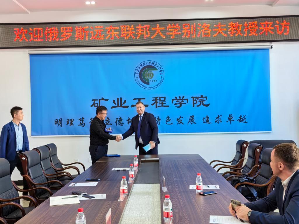 交流会上,肖福坤对远东联邦大学别洛夫·阿雷克谢教授一行来访表示热烈欢迎,并为来宾赠送了礼物。他介绍了学院在人才国际化培养、中外合作办学、地质专业建设、国际科研合作等方面的工作,希望能与远东联邦大学开展多维度国际合作,为中俄高等教育交流再添成功案例。