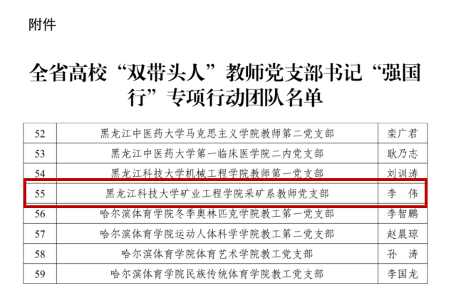 近日,黑龙江省委教育工委公布了全省高校“双带头人”教师党支部书记“强国行”专项行动团队名单,新葡官网采矿工程系教师党支部(负责人:李伟)入选。