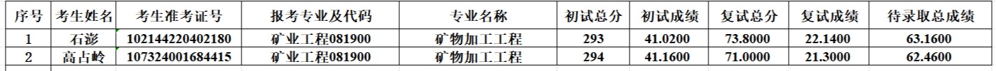 3003新葡官方网站2024年硕士研究生考试第七批调剂复试(矿物加工工程)待录取考生名单