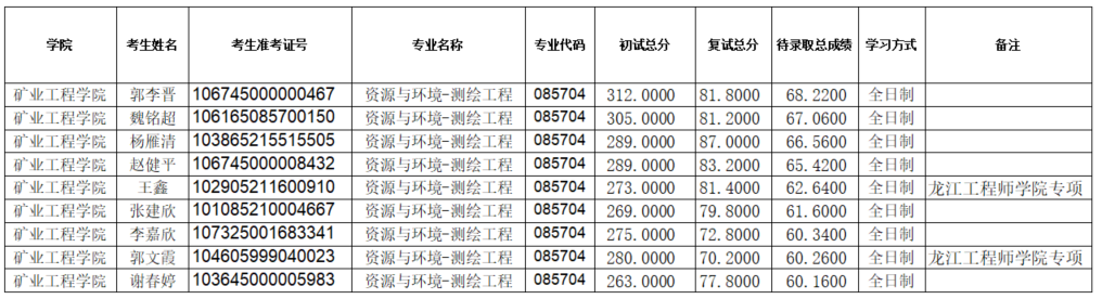 3003新葡官方网站2025年硕士研究生招生考试(资源与环境-测绘工程)第一次调剂待录取名单